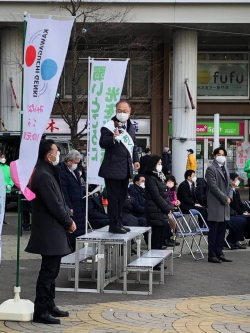 大野元裕埼玉県知事、新藤義孝衆議院議員をはじめとする応援演説、おくのき信夫候補の決意表明は、寒さを吹き飛ばすほど、熱のこもったものでした。